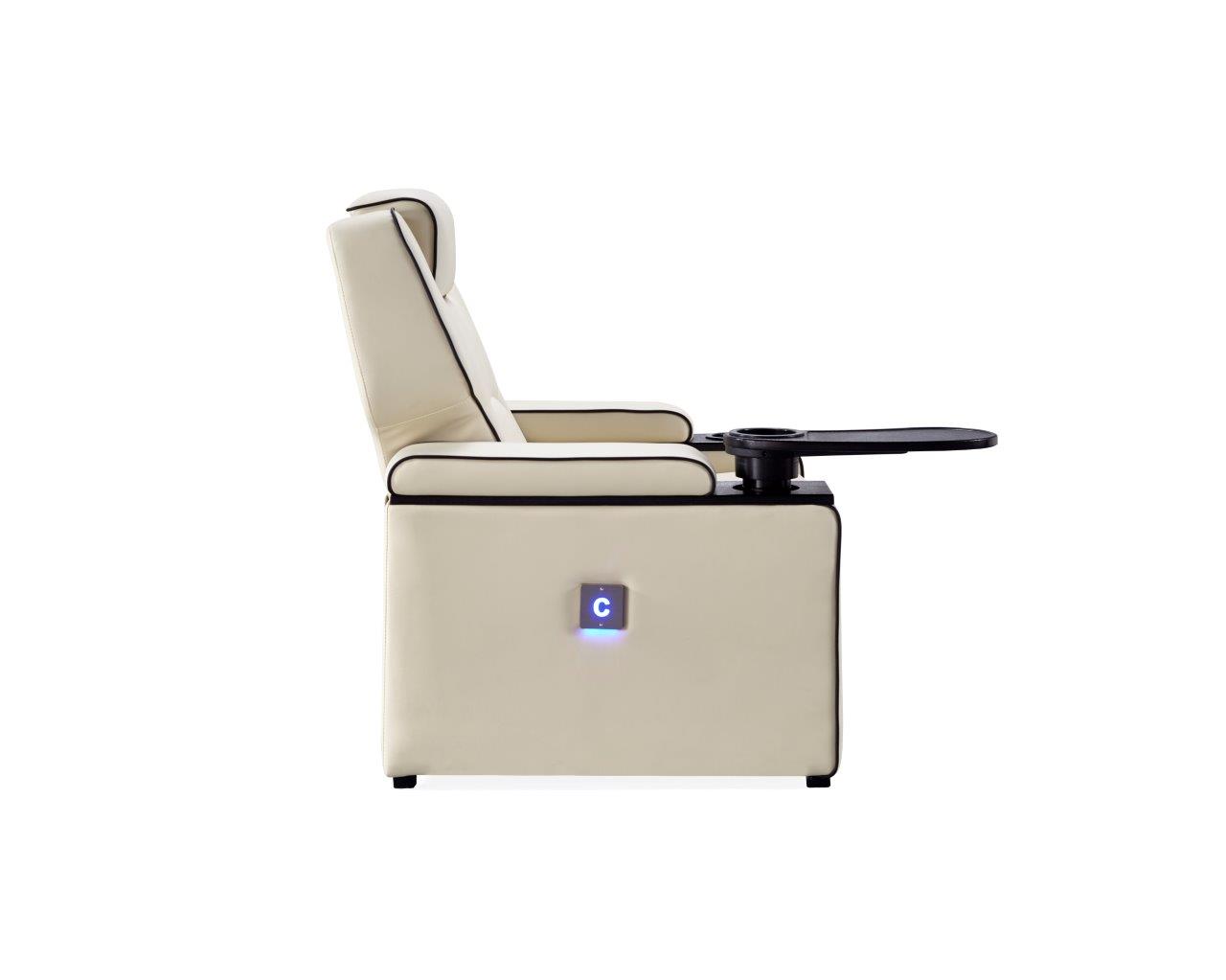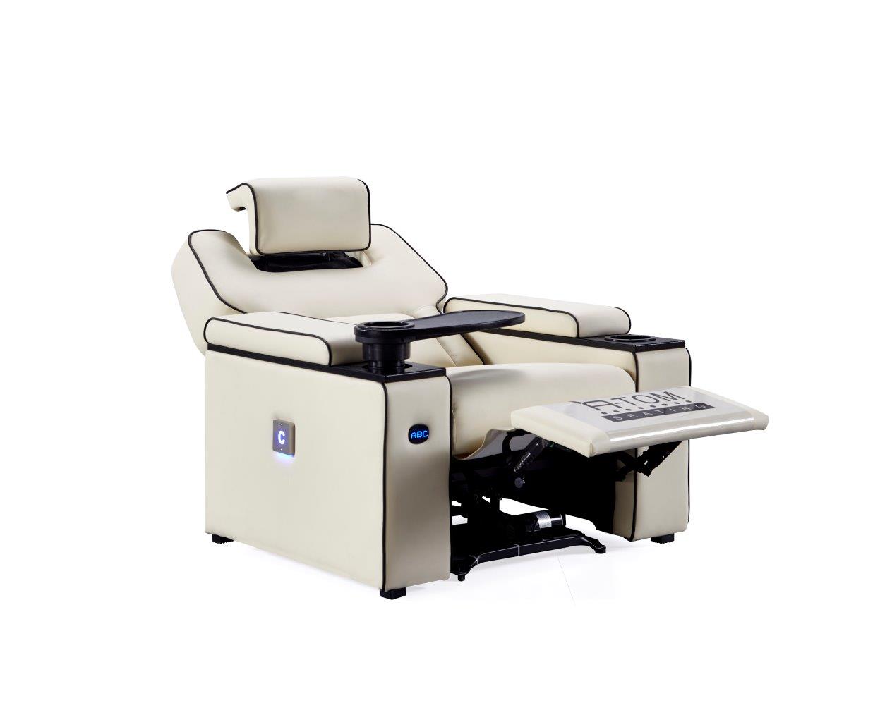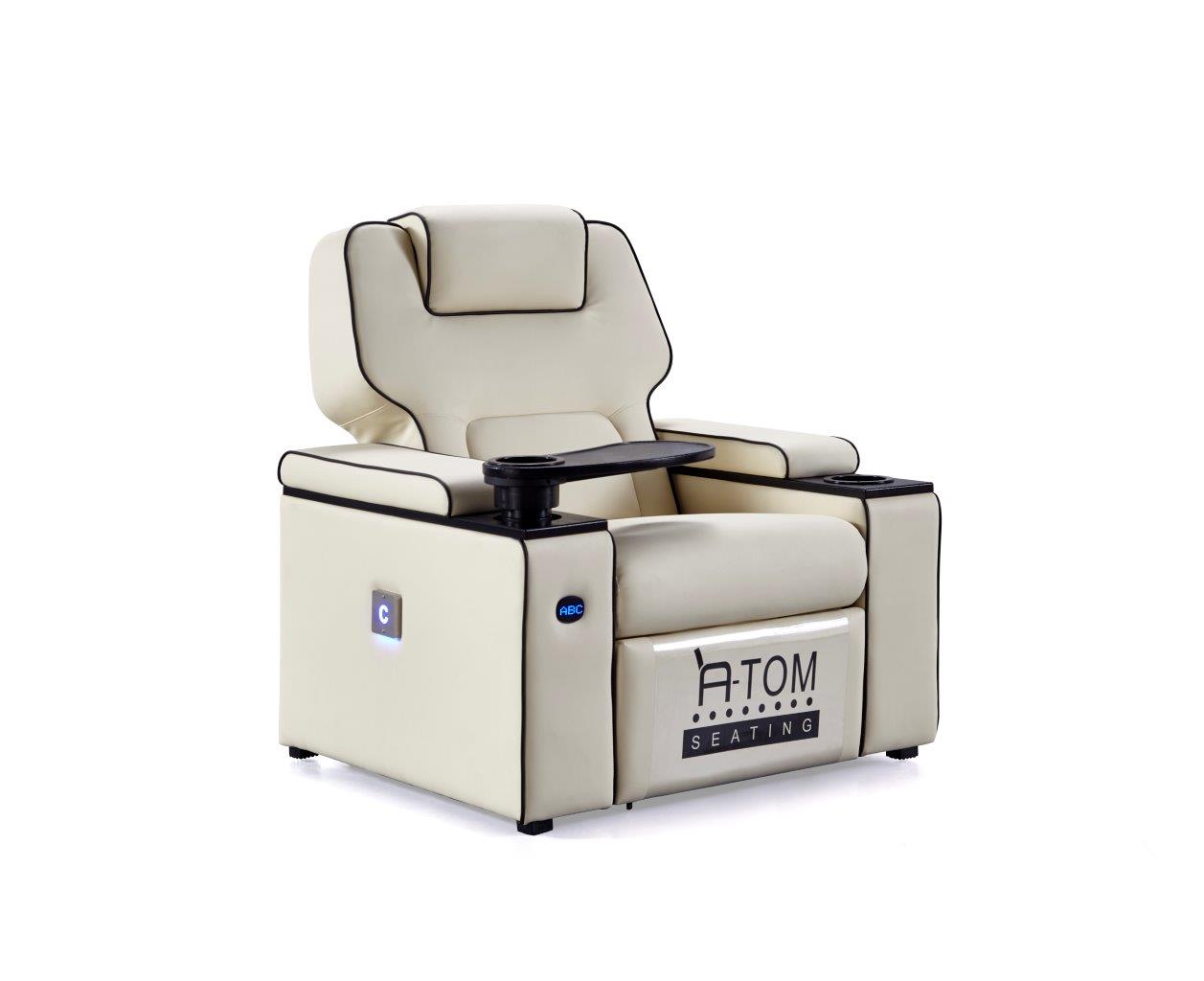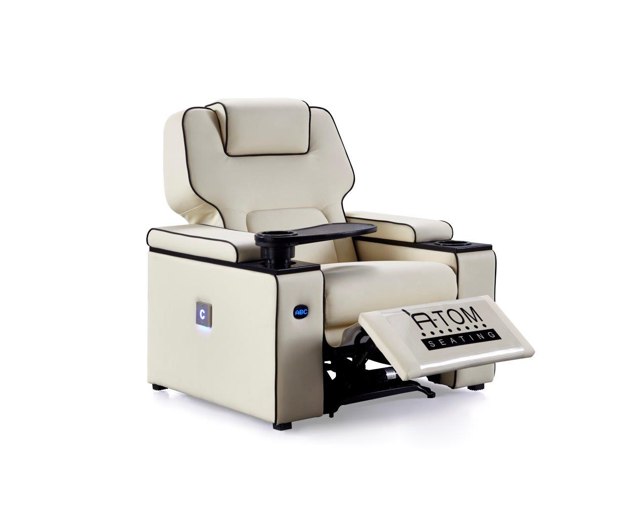 Platinum recliner av Atom Seating er fullspekket med en rekke funksjoner med tanke på dagens krav fra kinoer og publikum. VIP-reclineren er like komfortabel som den er luksuriøs. Det romslige designet, en glatt luksuriøs skinnfinish og utført i formstøpt skum for den perfekte sittekomfort og filmopplevelsen, er bare toppen av isfjellet når det gjelder funksjoner og fordeler med denne reclineren.
